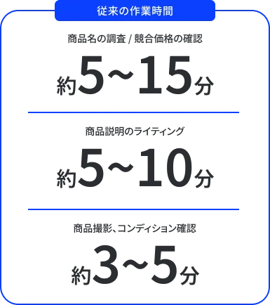 「AI出品」導入後の総作業時間は、わずか3~5分。最も時間を必要とする商品調査と商品説明のライティング(約10~25分相当)を「AI出品」が代行することで、作業は写真撮影とコンディション確認に集約。